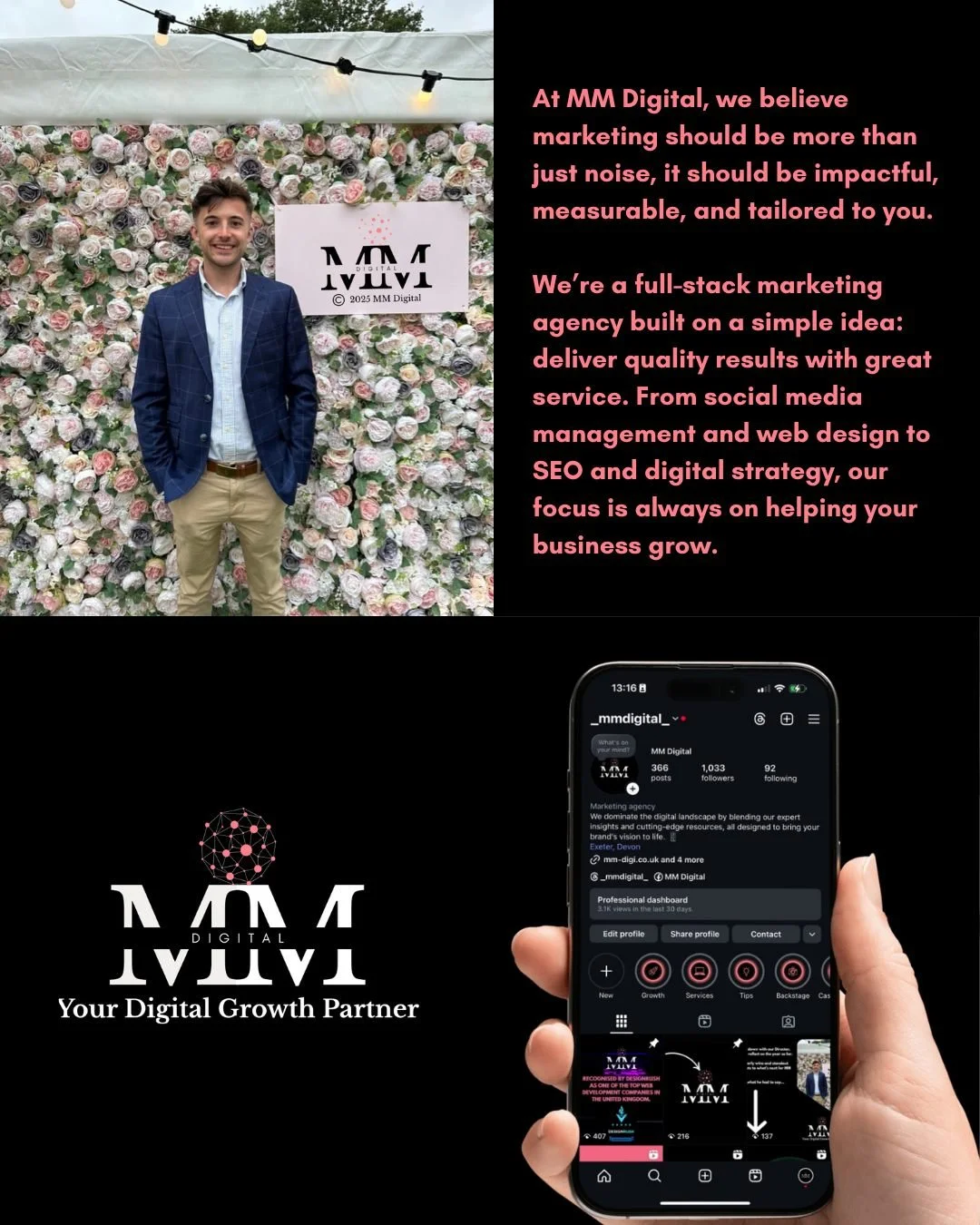 Unlock Your Brandβs Potential with MM Digital. We specialise in crafting innovative, results-driven digital strategies that accelerate growth, boost engagement, and transform businesses. From tailored social media management to content creation, digital marketing and more, we provide the expertise and support you need to grow your brand. Personalised strategies that deliver measurable success to take your vision further.